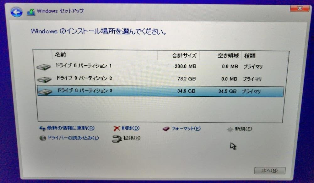「ドライブ0 パーティション3にWindows をインストールすることができません」のワーニングメッセージが消えます。