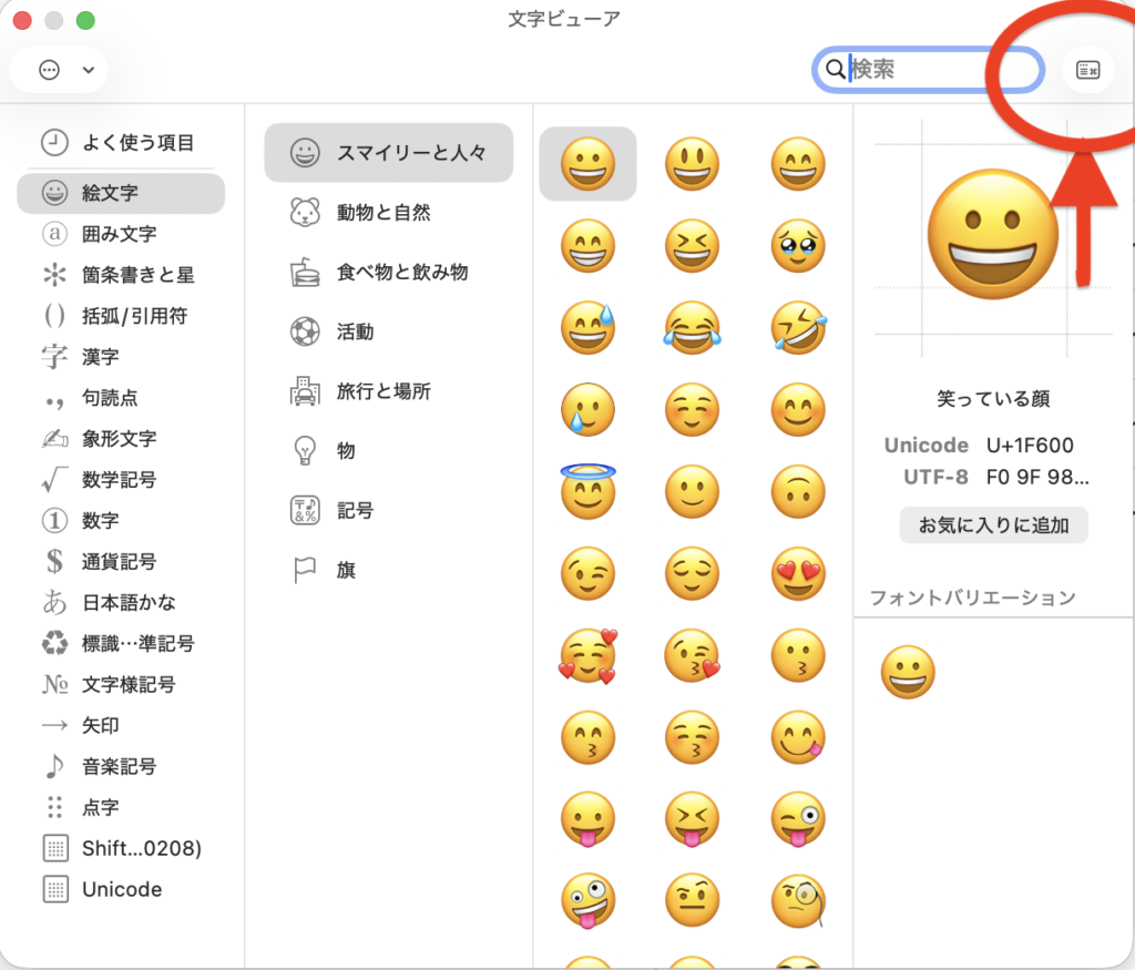 「アイコンとテキスト」に元に戻したい場合は、右上のアイコンをクリックします。入力対象エリアによっては表示されない場合もあります。FinderやSafari上で文字ビューアを表示すると切り替えるアイコンが表示できます。
