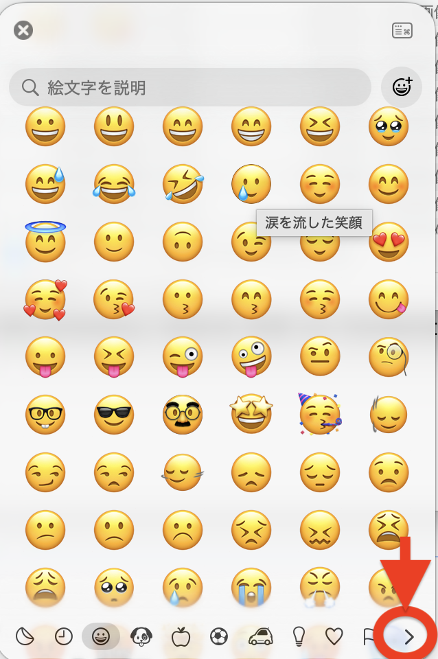 - 文字ビューアはどこでも起動できます。Control+Command+Spaceキーの同時押し、fnキー(🌐マークのキー:これはシステム環境設定 キーボード 🌐キーを押しての項目で「絵の字と記号を表示」を選択している場合に利用できます)、メニューバーの編集→絵文字と記号