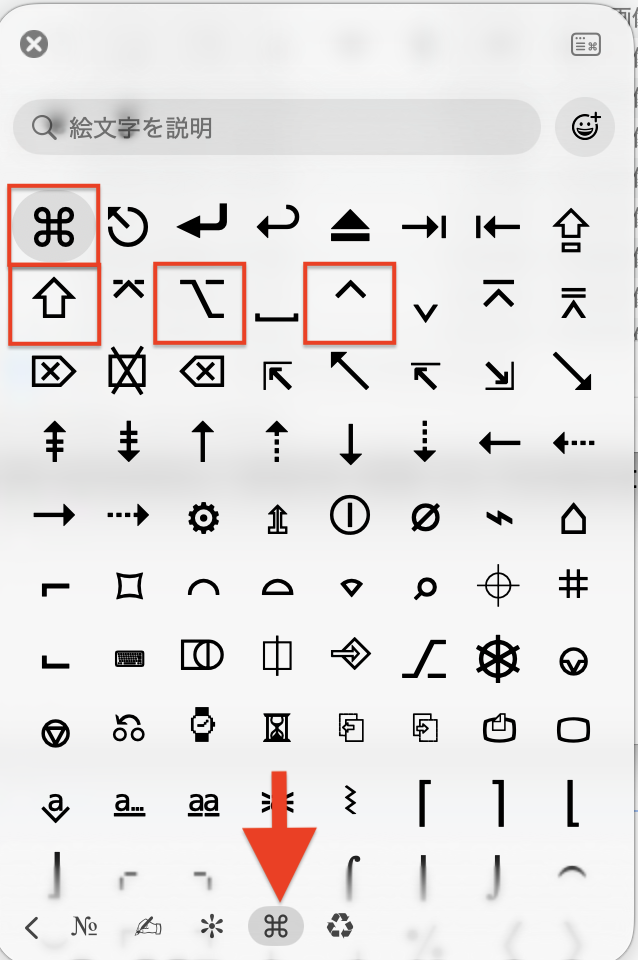 ⌘マークを探して、クリックします。そこに⌘⇧⌥⌃等の修飾キーの文字があります。