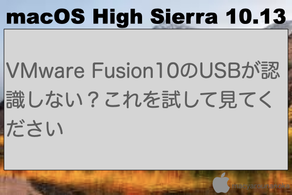 MacBook Pro Retina Late2012にmacOS High Sierra(10.13)をインストールしています。ここにVMware Fusion10(10.0.1)をインストールし、Windows10(Prevew版)を動かしたところ、macに接続したUSBデバイス(USBハードディスク、USB SSD)を認識してくれませんでした。この記事でそんな状態でお困りの状況を解決できます。