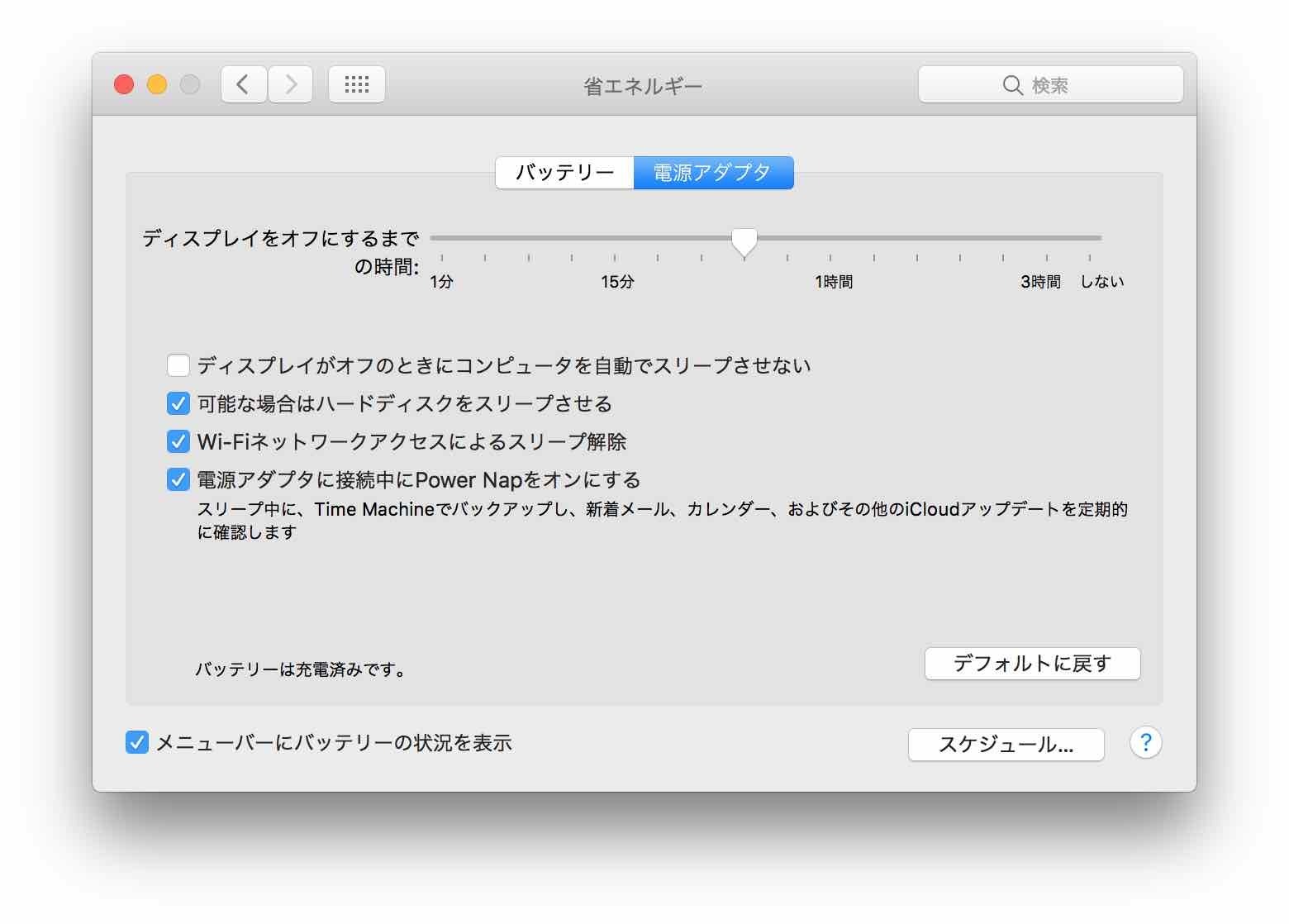 macOSはディスプレイをOFFにする時間を設定できます。通常ディスプレイOFFと連動してスリープします。設定で連動させないこともできます。設定はシステム環境設定の省エネルギーでできます。バッテリー駆動時と電源アダプター駆動時別々に指定できます。